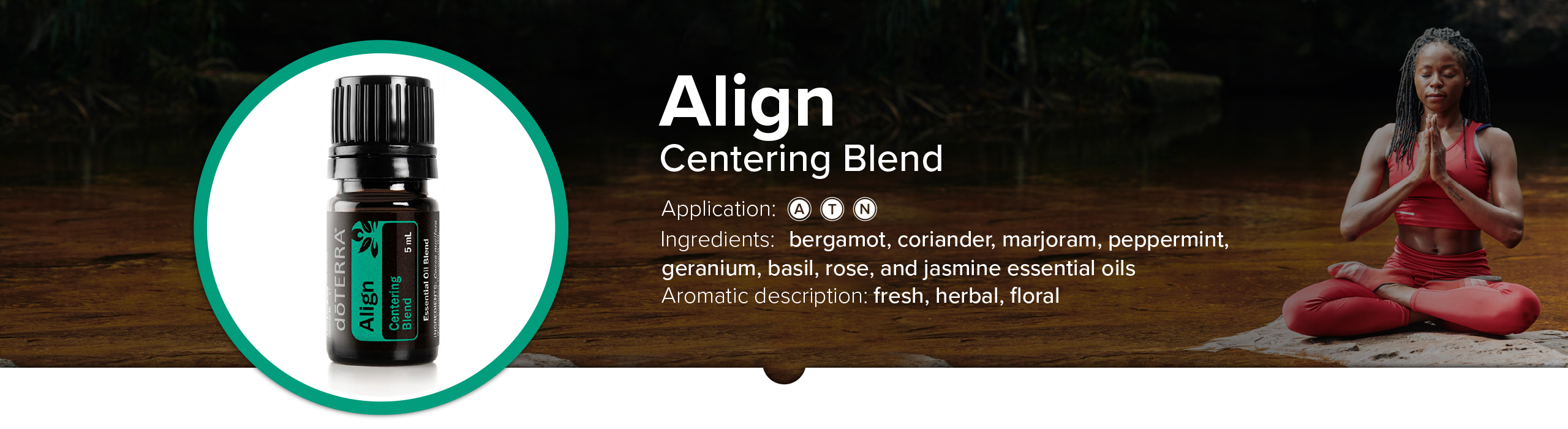 dōTERRA Align Calming Blend is a part of the Yoga Collection formulated specifically for enriching yoga and meditation experiences. Align’s unique blend of aromas and chemical compounds all work harmoniously in creating an essential blend for emotional health. Use Align in the mornings along with positive affirmations or when the need to feel grounded arises.