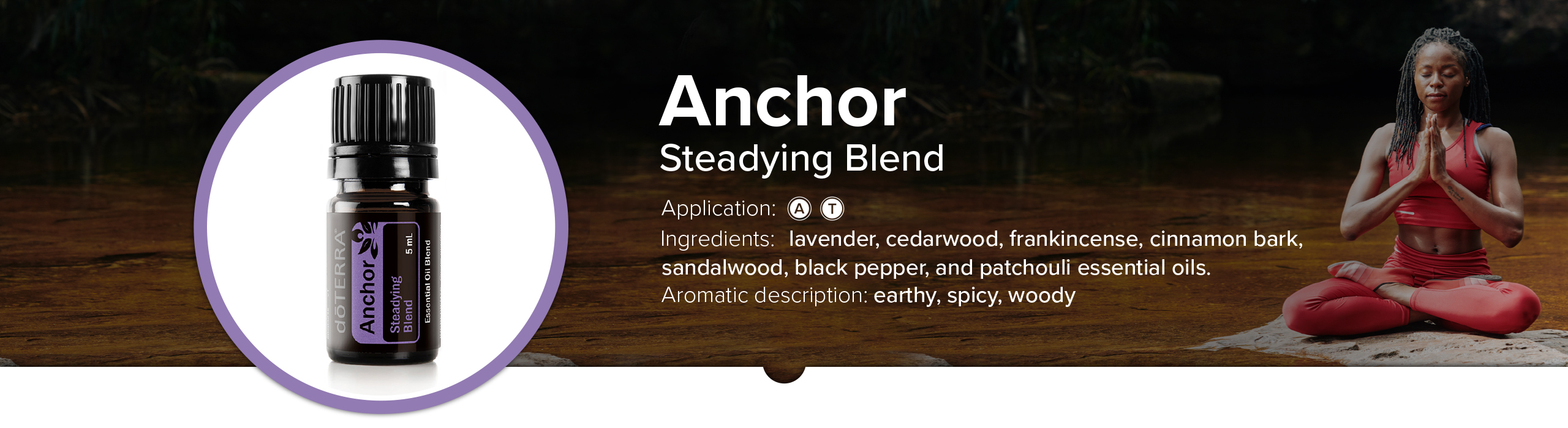 dōTERRA Anchor Steadying Blend is one of three oils featured in the Yoga Collection formulated specifically for enriching yoga and meditation experiences. The chemical compounds in Anchor work harmoniously together to create the ultimate calming blend for an overall sense of grounding and tranquility. Use Anchor in the mornings along with positive affirmation or when emotional support or motivation is needed.
