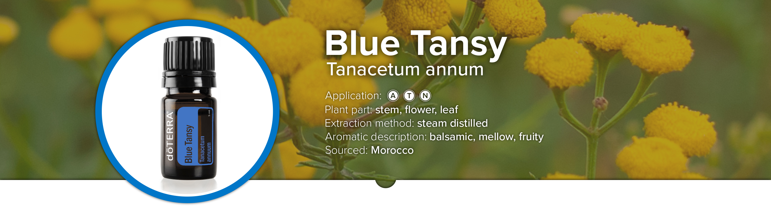 Derived from the vibrant yellow blue tansy flower of Morocco, blue tansy essential oil promotes restoration of skin, muscles and mood. The fragrant uplifting aroma makes it an excellent choice to diffuse to reduce stress and promote joyfulness. The primary chemical component of the oil , sabinene, supports healthy radiant skin. Used in doTERRA Deep Blue Rub, the chamazulene chemical component of the oil promotes muscle health and can help soothe inflammation.