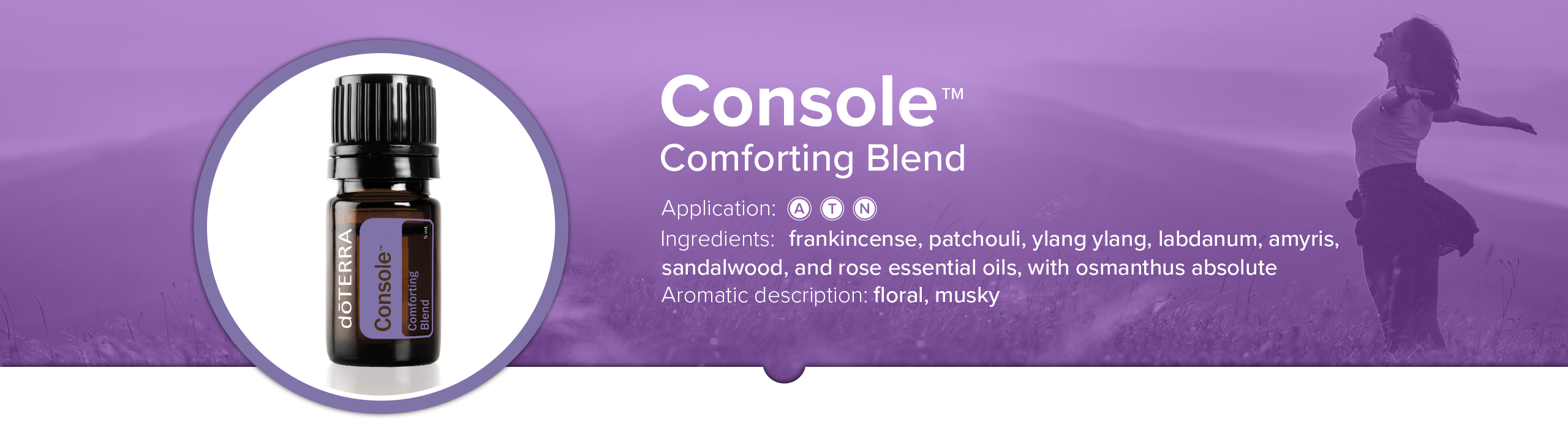 Console comforting blend is formulated for emotional health.The blend, floral in composition and aroma, promotes peace of mind and uplifts a sorrowful spirit.