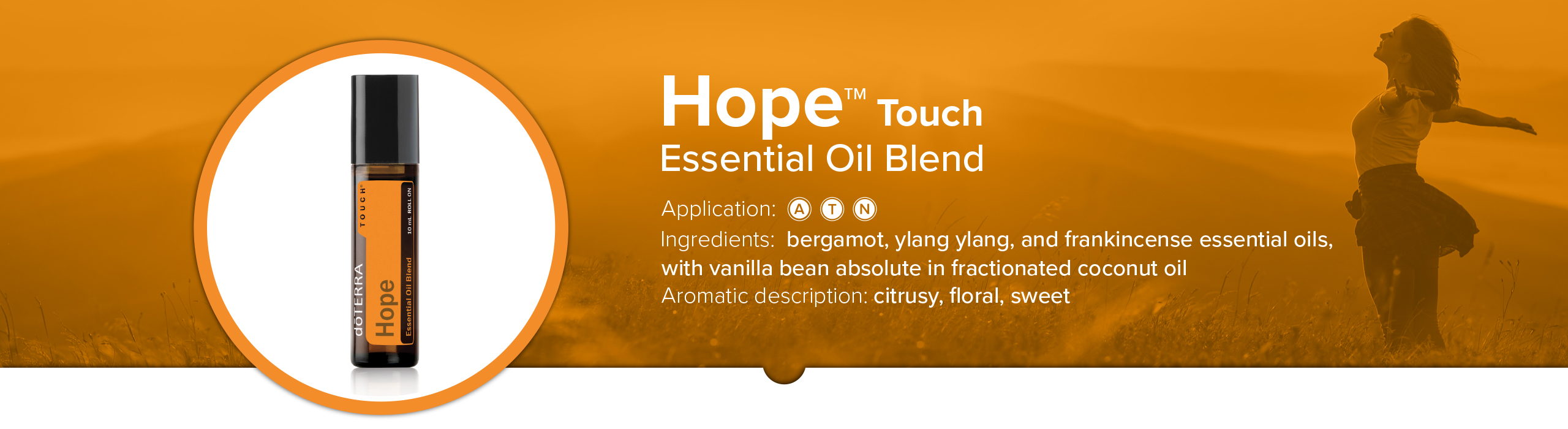 Hope Touch is a special blend of three potent essential oils with therapeutic and calming properties. In addition, the blend’s sweet invigorating fragrance has the ability to boost your mood throughout the day. Proceeds of this product go to the doTERRA Healing Hands Foundation which is working to end human-trafficking worldwide.