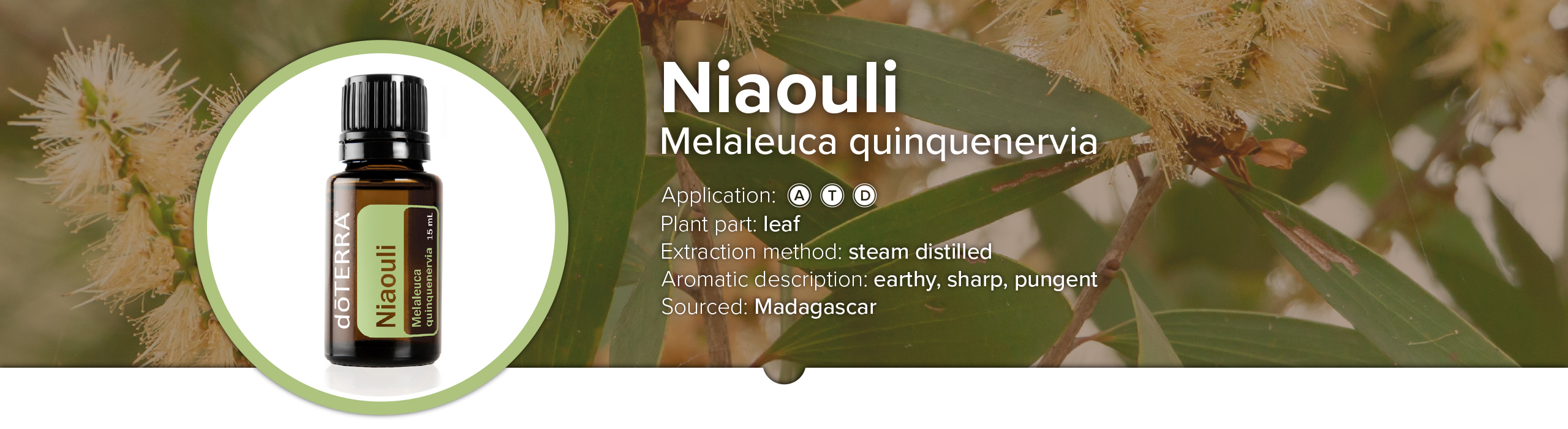 Niaouli is commonly known as the paper bark tree or the punk tree. Some would say niaouli is similar to, but stronger than tea tree oil. In the US, the niaouli plant was introduced to Florida, specifically the Orlando area, in 1900. Florida brush fires caused the plant to grow vigorously, flowering in just weeks. The USDA has since classified this plant as a weed. Melaleuca quinquenervia trees can live to over 100 years old and can withstand droughts and floods. doTERRA’s niaouli is sourced in Madagascar.
