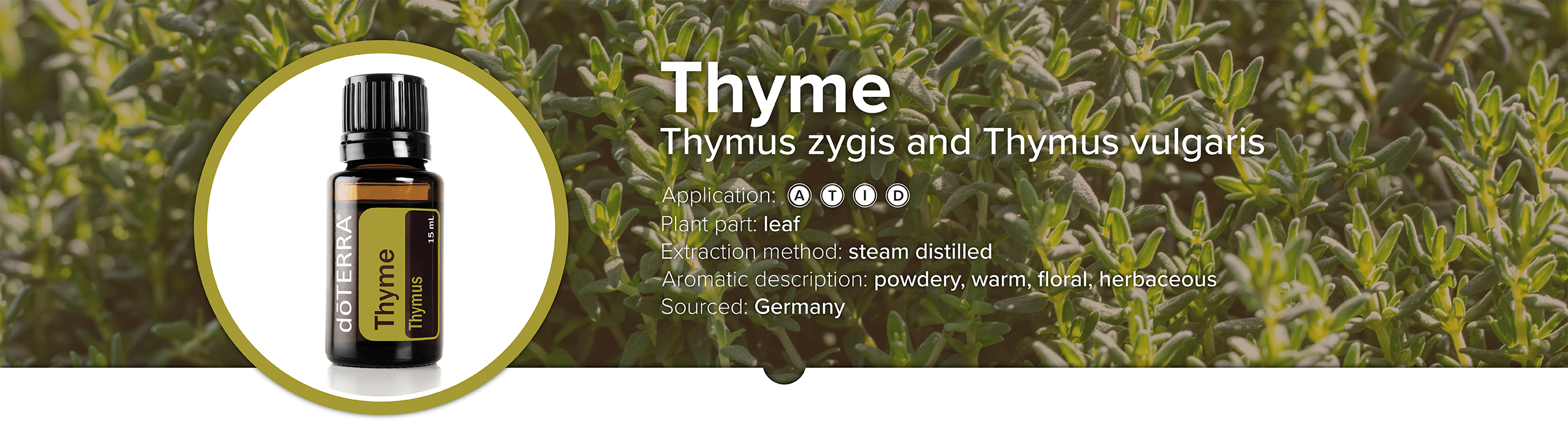 A blend of two species of Thymus (Thyme), Thymus zygis and Thymus vulgaris